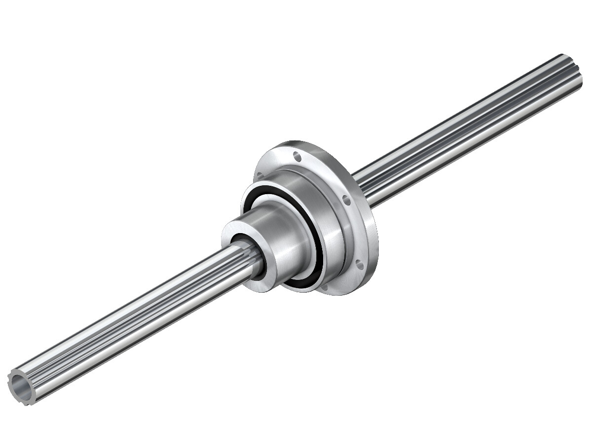Ball splines of the FSR series are equipped with a drivable ball spline nut. The nut is firmly fastened to the application with the flange, while the inner part of the nut can be rotated in relation to the flange thanks to the bearing. The nut is then connected to a servo motor via a belt pulley, for instance, which can be used to rotate the nut and shaft.